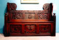 This settle was carved to fit under one of the windows which open out to the verandah of 'Gracemere' - the Archer family crest is carved into the back. The flanking panels, [show detail and link here] carved with interweaving foliate 'strap' leaves are very subtly handled. This Nordic style of carving appears to have a close connection with Celtic interlacing, which is one of the components of the art nouveau manner in the British Isles. The interlaced carving of the sides of the settle (not visible in this photograph) has a dynamic movement, which demonstrates an even more marked affinity with art nouveau.